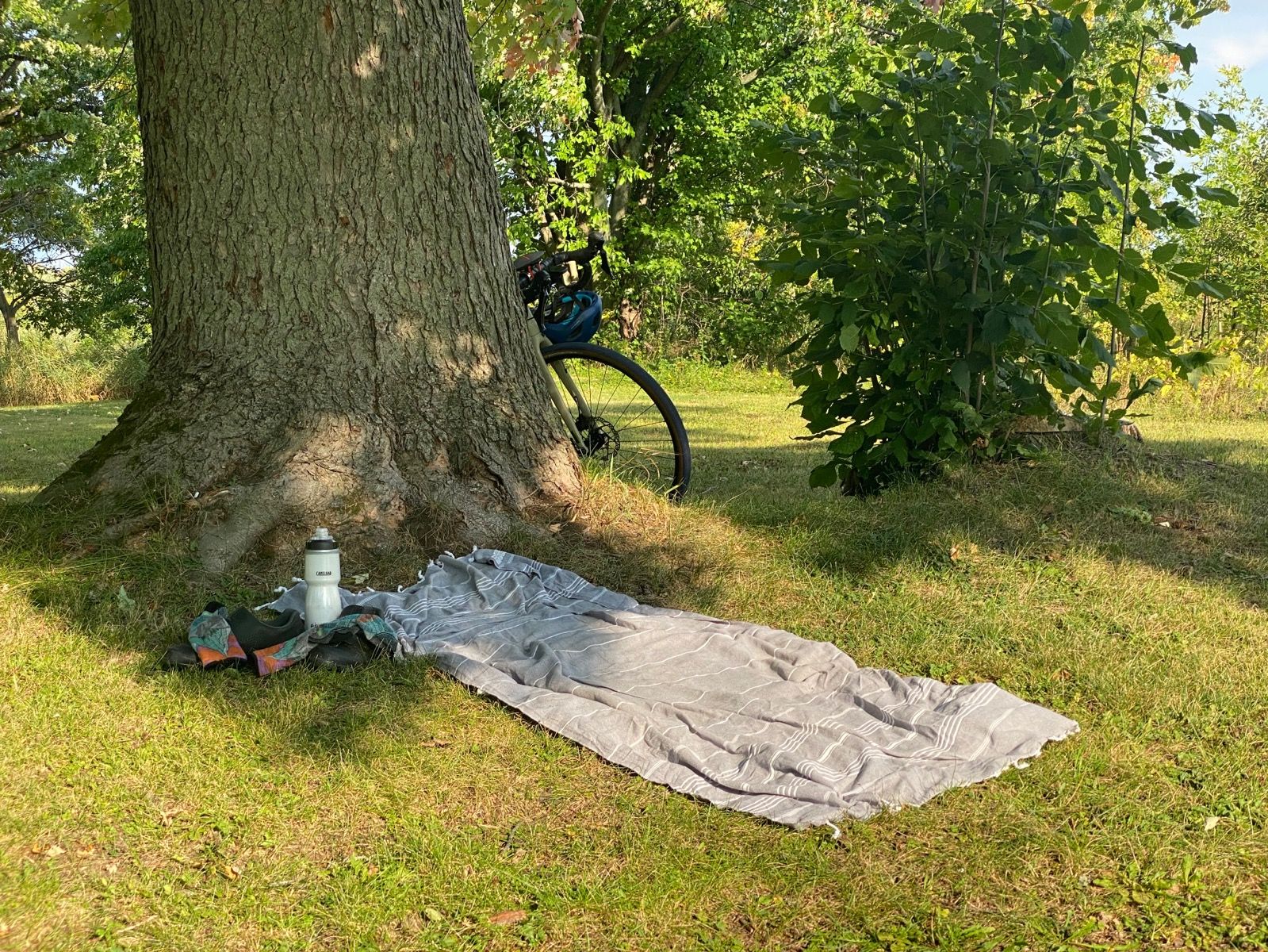a blanket on the ground by a tree and a bicycle