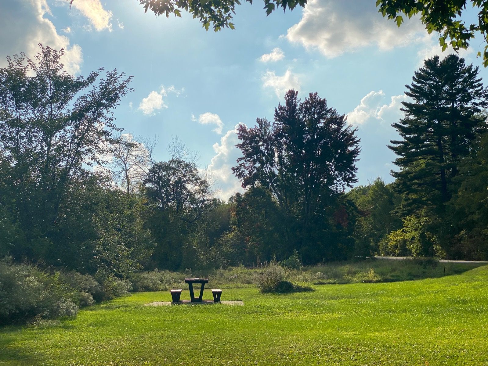 a grassy area with trees in the back